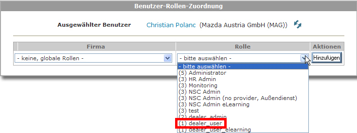 Hier wählen Sie die gewünschte Rolle aus (im Normalfall "(1) dealer_user") und klicken auf den Button "Hinzufügen".